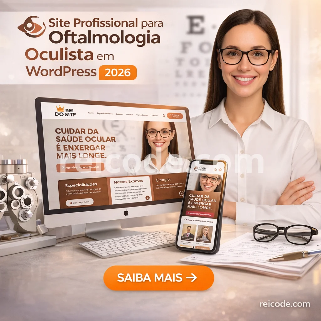 O Site Profissional para Oftalmologia Oculista em WordPress 2026 da reicode.com foi desenvolvido especialmente para clínicas oftalmológicas, médicos oculistas e profissionais da saúde ocular que desejam transmitir credibilidade, confiança e profissionalismo online.